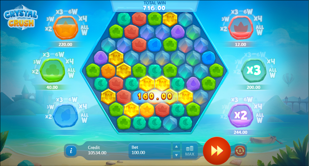Crystal Crush by Playson is an advanced slot-machine with hexagonal game field consisting of 61 cells. The most unusual feature of this slot is cluster pays which means that winnings are paid for 5 or more alike symbols, which are adjacent by side. Other types of symbols are: