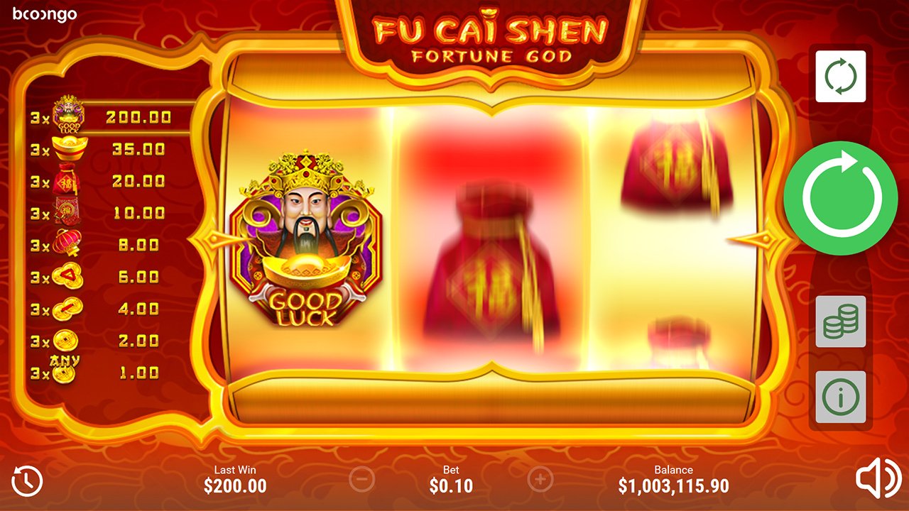 Fu Cai Shen by Booongo is a classic 3-reels 1-line slot. The main character Fu Cai Shen is an eastern God of Fortune adored much by people in Asia. Lucky symbols appear on the reels and turn bets into big winnings. Pouch of Plenty allows you to collect your golden coins to carry as much wealth as possible.