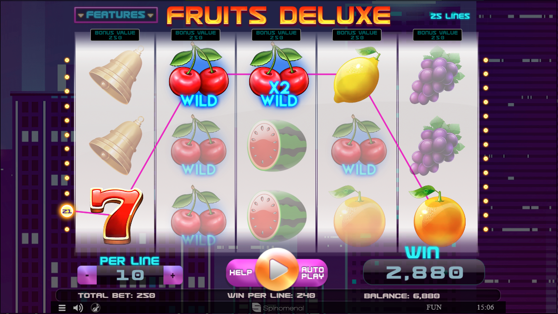 Fruits Deluxe by Spinomenal is another fresh and juicy slot machine in our collection. It has 5 reels, 3 rows and 25 winning lines. This slot has the following features: