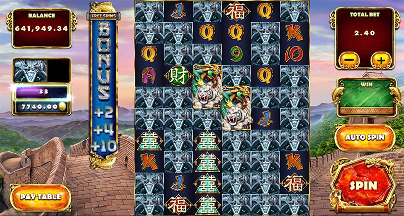 Tiger and Dragon by Redrake is a 6 reels and 10 rows slot with millions of combinations that are only valid from left to right. Spins with winning combinations will activate elements on the BONUS panel located near the reels. Once all elements are activated, you access the free spin feature. So you get free spins by activating the B-O-N-U-S letters, that means If you connect 5 or more re-spins in the same spin, you will get free spins. On the left panel you can see the progress bar, which indicates how many free spins you get. If you do not get 5 consecutive re-spins, the progress bar will be voided and you will have to start again. The special BONUS symbol activates an additional element of the panel. There is an infinite free spins prize multiplier that starts at 1 and increases after each re-spin. If the free spins feature total prize is less than x10, you will get 6 additional spins.