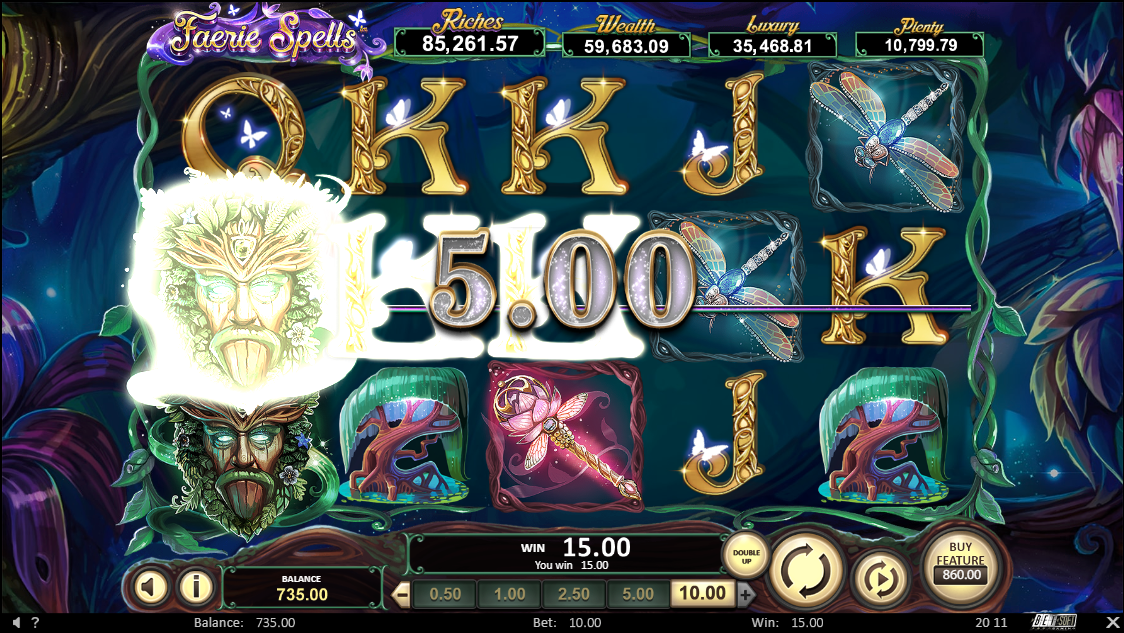 Faerie Spells by Betsoft is 5 reels, 3 rows slot-machine with free spins that can be triggered by 3 or more Faerie Queens on the reels. Also Faerie Queen releases bonus prize of Magic Toadstool up to x5,250. If you are tired looking forward to free spins you can activate a Buy Feature that will trigger 25 free spins. Free spins in Faerie Spells have the following features: