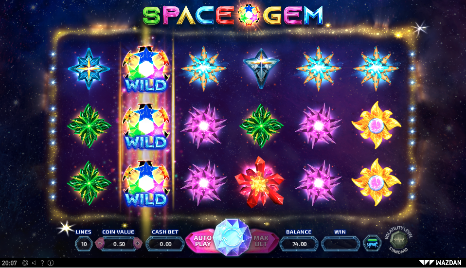 Space Gem by Wazdan is a 6 reels and 3 rows slot-machine. The rules of the game are quite simple: all wins are paid for the same symbol's combinations on each of 10 winning lines both ways. On active line only higher win is paid. Wild symbol in each row makes all 3 symbols on its reel wild. Moreover it allows you to re-spin all other reels. If after the re-spin a wild symbol appears on another reel you will continue re-spin remaining reels. All winnings will be summed upon the last re-spin.