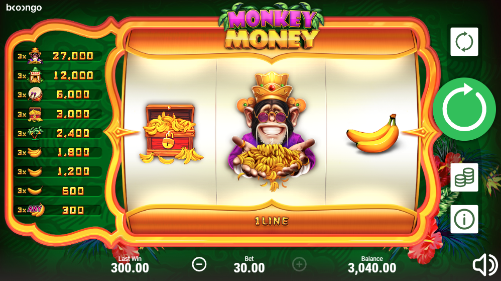 Monkey Money by Booongo is a classic three-reel single-line slot machine. The maximum win on it will multiply your bet by 900. Such simple slots are always in demand, and the colorful design of bananas, palm trees and chimpanzees in a golden hat will make your pastime behind this slot machine funny.