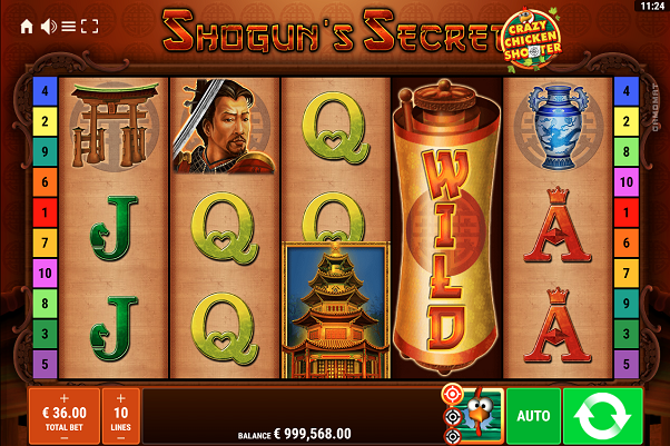 Shogun's Secret Crazy Chicken Shooter произведенный компанией Gamomat это игровой автомат с пятью барабанами и тремя строками. Основная игра в этом слоте это Shogun’s Secret, которая перенесет вас в средневековую Японию. В этом слоте можно выбрать между 5 и 10 оплаченными линиями. WILD символом является Свиток, который может заменить любой другой символ, кроме Храма. Три или более Храмов, появившихся на барабанах, запускают 12 бесплатных прокруток. Во время бесплатных игр есть вероятность выпадения 1, 3 или 12 дополнительных бесплатных прокруток. Их запускают 1, 2 или 3 выпавших одновременно Свитка. Кроме того, Свитки во время бесплатных игр обновляют менее ценный символ из строки над барабанами, на следующий, более ценный. Замененные в этой строке символы заменяются и на барабанах, что может принести дополнительный выигрыш. По окончании бесплатных игр строка возвращается в исходное состояние и в новом раунде бесплатных игр будет снова содержать 6 различных символов.