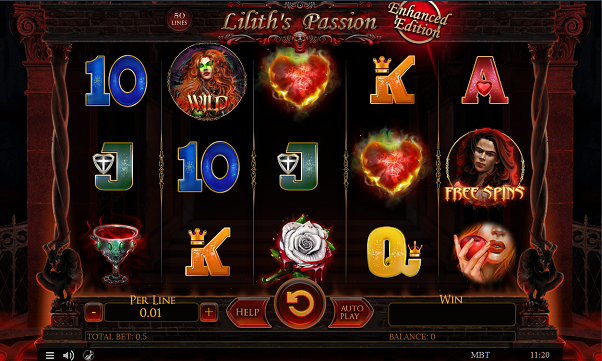 Lilith's Passion Enhanced от Spinomenal это трехстрочный игровой автомат с пятью барабанами и 50 выигрышными линиями, количество которых неизменно. Во время основной игры три или более символов “Бонус” запустят бонусную игру, а три и более символа “Free Spins” подарят вам 10 бесплатных прокруток. WILD символ заменяет любой обычный символ на барабанах, а три WILD символа на одном барабане превращаются в стыкующийся WILD, дающий право на еще одну прокрутку. Кроме этого, во время прокрутки барабанов на экране может появиться множитель выигрыша, который применится к сумме выигрыша текущего раунда. В игре присутствуют и мистические символы - они, появляясь на барабанах, превращаются в любой обычный символ.
