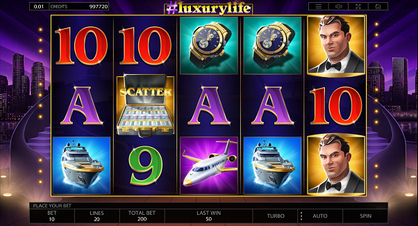 #luxurylife от Endorphina, пожалуй, самая простая игра в этом обзоре. 5 барабанов, три ряда символов, выбор количества выигрышных строк от 1 до 20. 3 чемодана с деньгами запускают 20 бесплатных прокруток, а представительный джентльмен с бабочкой является WILD символом, заменяющим любой другой, кроме кейса с наличными. Кроме того, WILD символ удваивает выигрыш, заменяя собой другой символ.