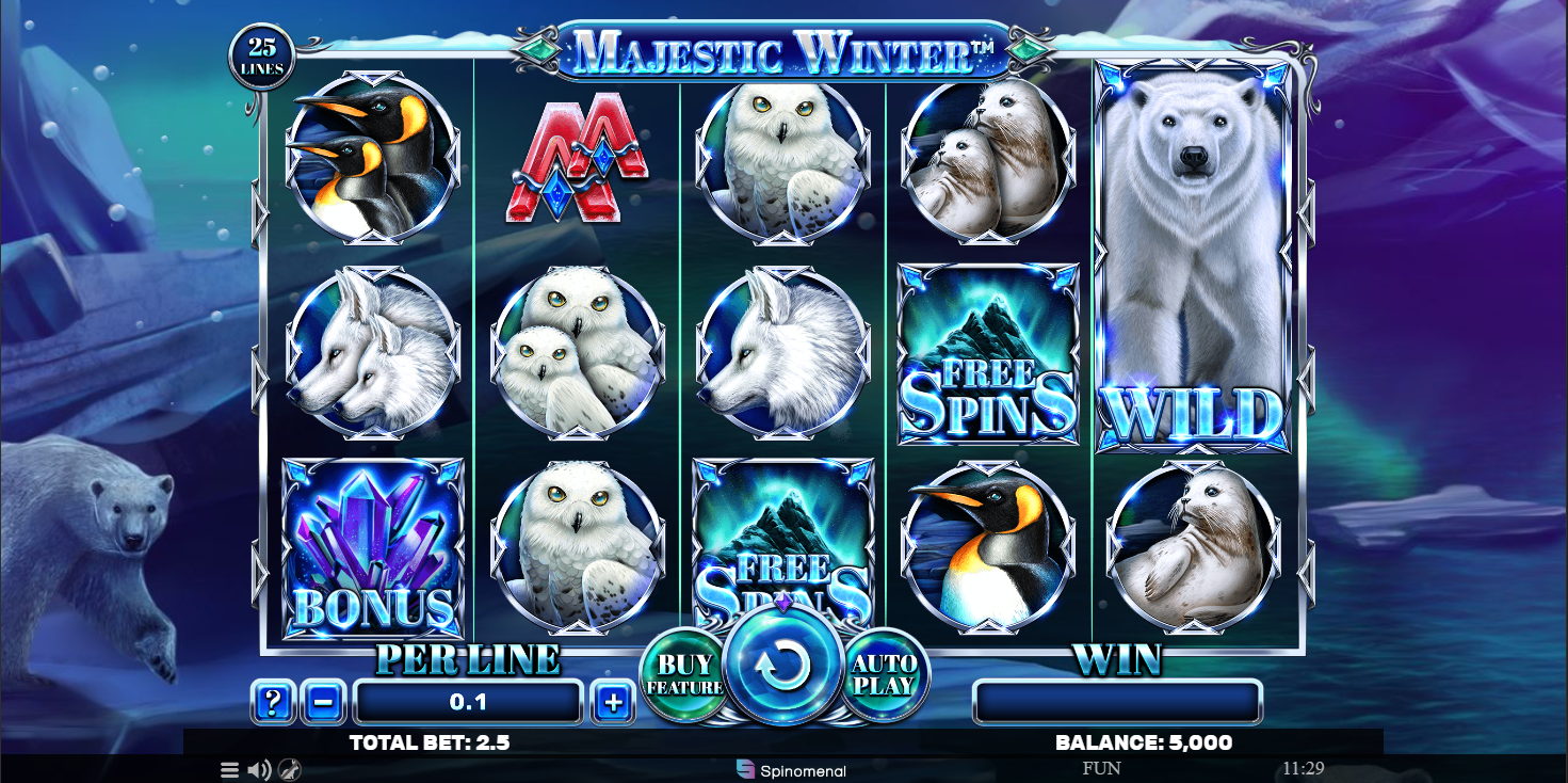 Many people can't wait for the winter to be over, but surely there are nearly as many of those who would love to go back to the winter wonderland, especially in the middle of hot summer. In any case, we decided to bid our own farewell to the winter season by including an Arctic-themed slot from Spinomenal called Majestic Winter. It has a standard 5x3 layout with 25 paylines that pay from left to right.
