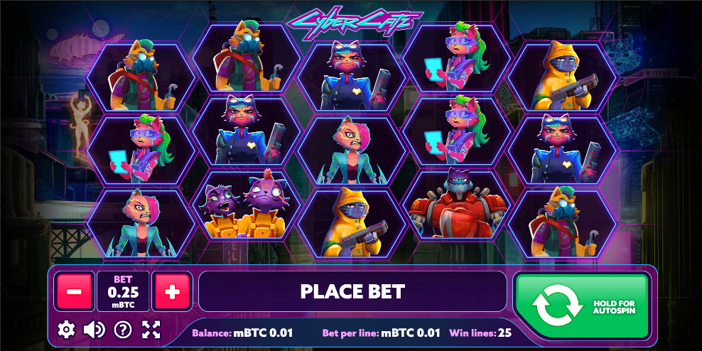 The action in the feline-dominated cyber world takes place on 5 hexagonal reels where 25 paylines form winning combos from left to right, with an average return to player ratio of 95.1%. The betting range here is as vast as the futuristic cyber world as it stretches from 25 mBTC to 2500 mBTC. The basic game offers the highest multiplier of 300 times the total stake. Cyber Catz has three special symbols, namely the Wild, the Free Spins, and the Bonus symbols. As usual, the Wild substitutes all lower-ranked symbols, whereas Free Spins offer up to 30 free turns of reels, and the Bonus opens access to the Cyber City Bonus game.