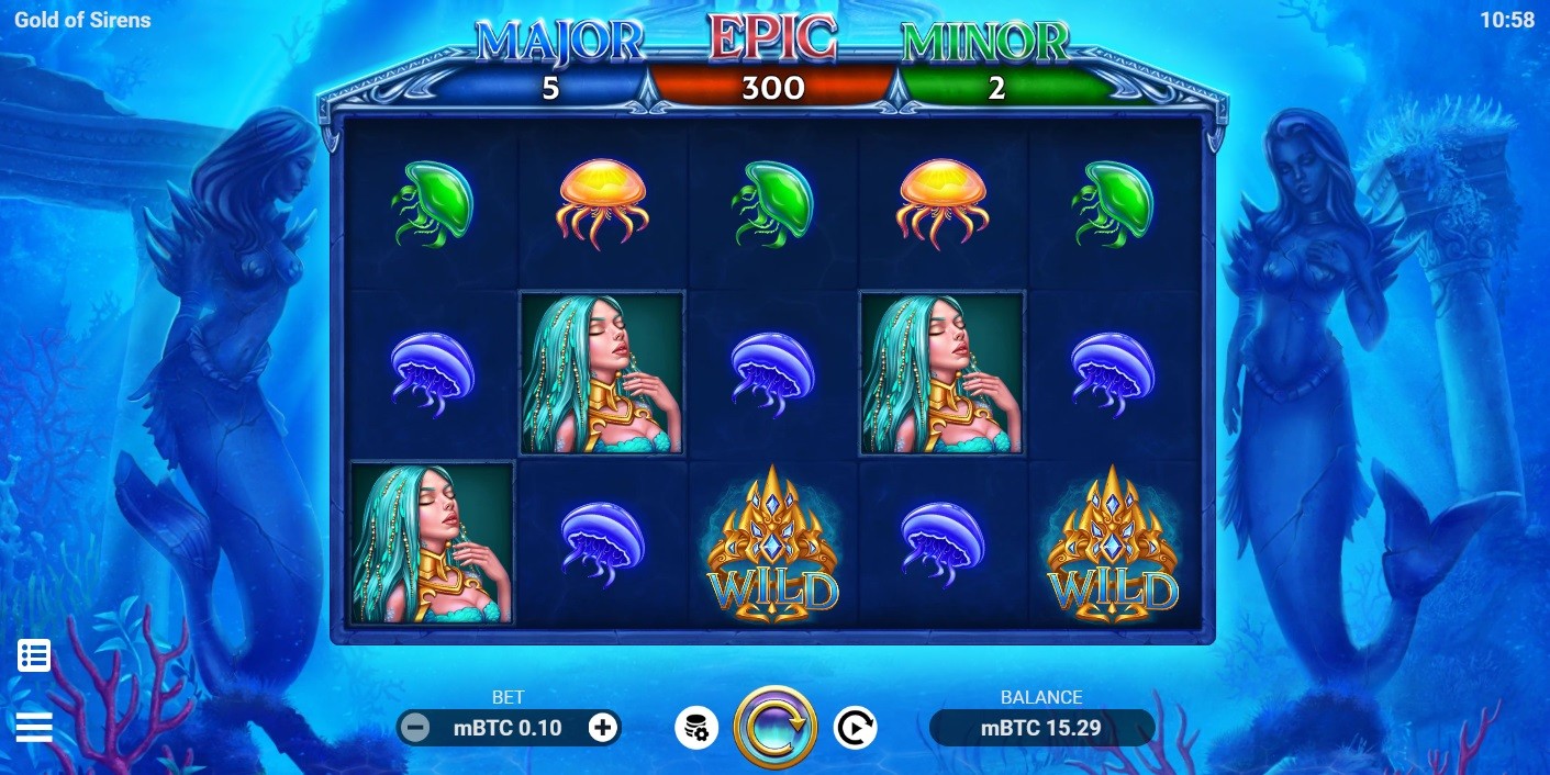 Gold of Sirens uses a standard format with 5 reels and 20 paylines where you get to meet the wicked sirens and Neptune, the god of the sea. The game has an RTP of 96.12% and a decent betting range, 0.1 mBTC - 100 mBTC. The estimated hit frequency here is 36%.